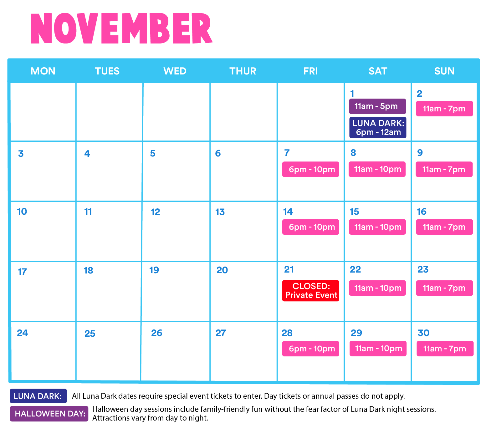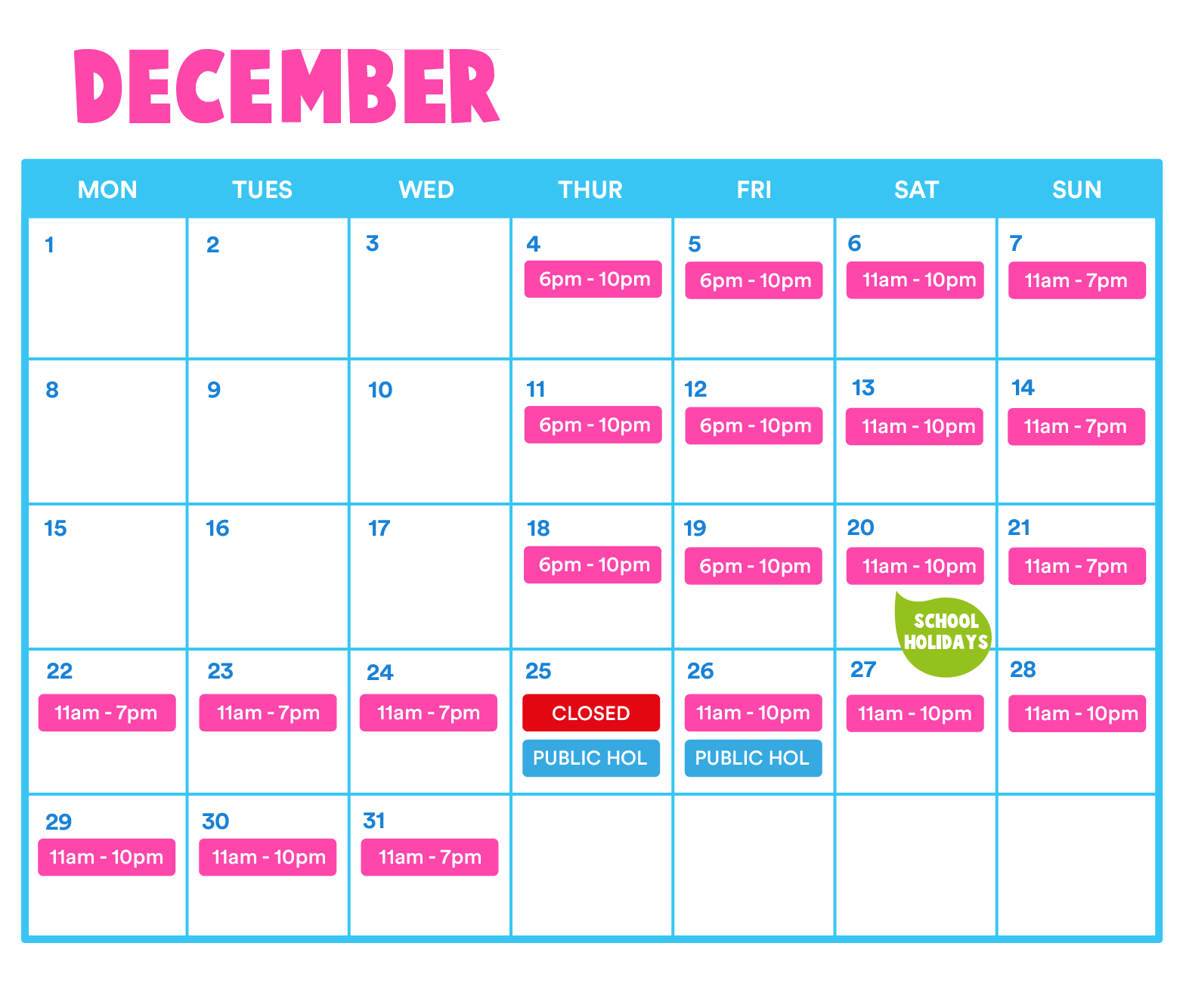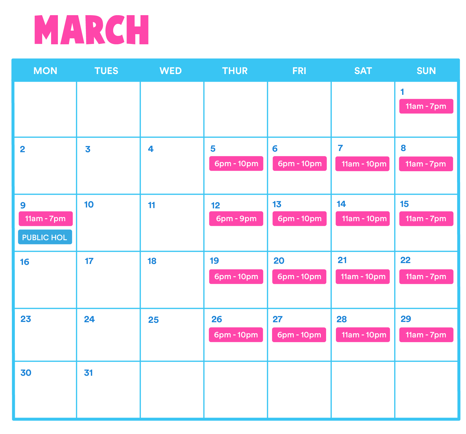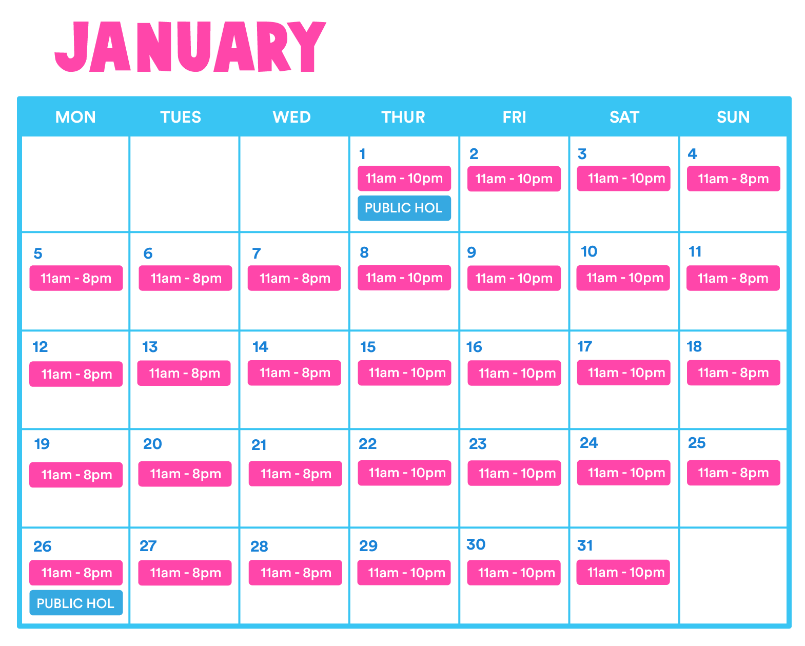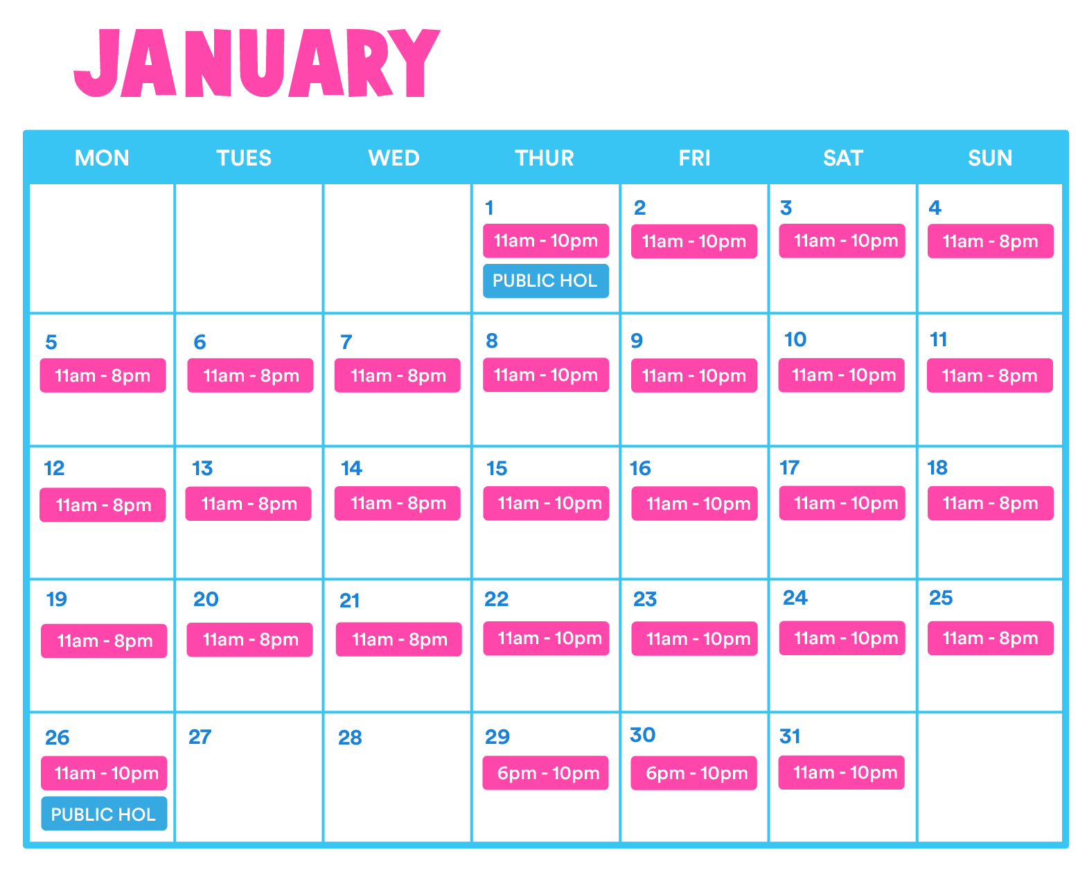 Get in quick by booking your tickets online today to guarantee your entry! Please note that the below planned opening hours may be subject to change due to weather – we recommend staying up to date via our website on the day of your visit.